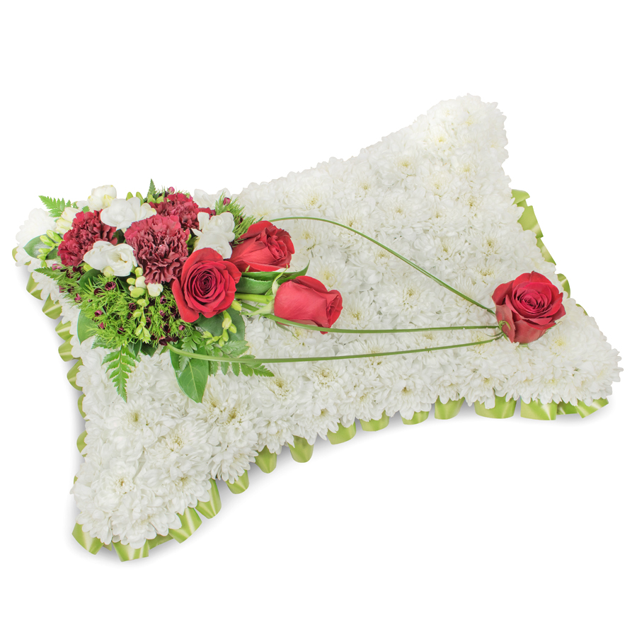 Express your sympathies with our heartwarming floral bouquet, featuring a charming mix of white chrysanthemums, vibrant red roses, delicate white freesias, deep red carnations, elegant dianthus, and bear grass.